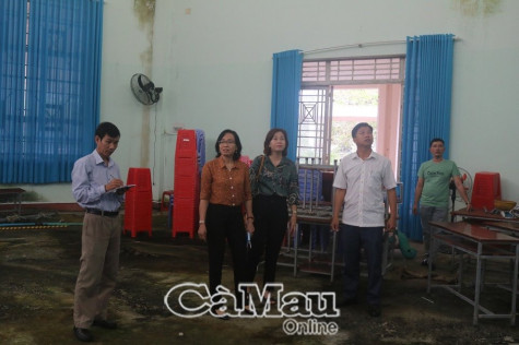 Bà Ngô Ngọc Khuê, Trưởng Ban Văn hóa – Xã hội HĐND tỉnh (thứ 2 từ trái sang) khảo sát các hạng mục xuống cấp Nhà Thiếu nhi huyện U Minh