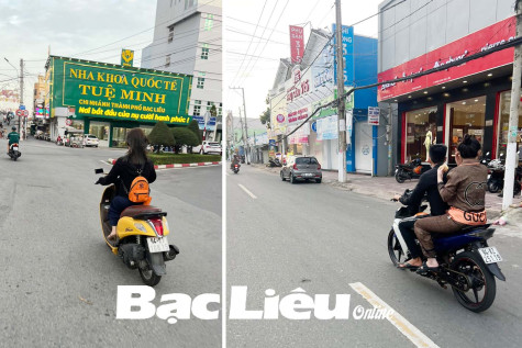 Hiện nay, hành vi điều khiển xe máy không đội mũ bảo hiểm diễn ra khá phổ biến trên nhiều tuyến đường TP. Bạc Liêu. Điều đáng nói, nhiều người dù có mang theo mũ bảo hiểm nhưng chỉ treo cho vui chứ không đội để đảm bảo an toàn cho bản thân - (ảnh). Phổ biến nhất của hành vi trên là các bạn trẻ, trong đó có nhiều em là học sinh.