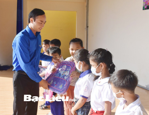 Bí thư Tỉnh đoàn - Phạm Tuấn Tài tặng cặp cho học sinh có hoàn cảnh khó khăn ở xã Ninh Thạnh Lợi (huyện Hồng Dân).