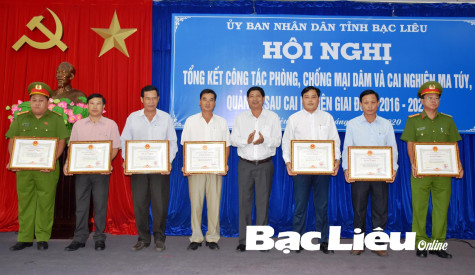 Tặng bằng khen của UBND tỉnh cho các tập thể, cá nhân có nhiều thành tích trong phòng, chống TNXH (ảnh chụp trước đợt dịch COVID-19 thứ 4 bùng phát). Ảnh: H.D