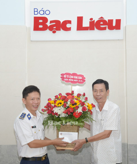 Bộ Tư lệnh Vùng Cảnh sát biển 4 tặng hoa chúc mừng Báo Bạc Liêu. Ảnh: H.T