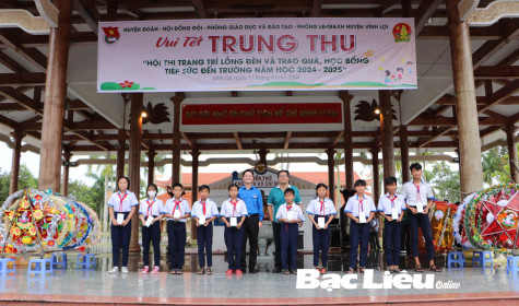 Chiều 17/9 (nhằm ngày 15/8 âm lịch), tại Đền thờ Chủ tịch Hồ Chí Minh (xã Châu Thới), Huyện đoàn Vĩnh Lợi phối hợp với Phòng GĐ-ĐT, Phòng LĐ-TB&XH huyện tổ chức chương trình vui tết Trung thu, hội thi trang trí lồng đèn và trao học bổng tiếp sức đến trường cho các em thiếu nhi năm học 2024 - 2025.