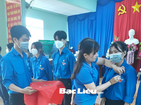 Lễ kết nạp đoàn viên mới của Xã đoàn Châu Thới (huyện Vĩnh Lợi). Ảnh: H.L