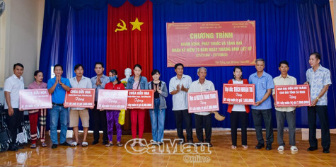 Tại đây, đoàn trao tặng 9 giếng nước, 10 xe lăn, 2 tấn gạo, 132 lon sữa bột cho các hộ gia đình chính sách khó khăn. Các y, bác sĩ Bệnh viện Mắt - Da liễu tỉnh Cà Mau tổ chức khám các bệnh lý về mắt và da liễu cho hơn 300 lượt người dân.