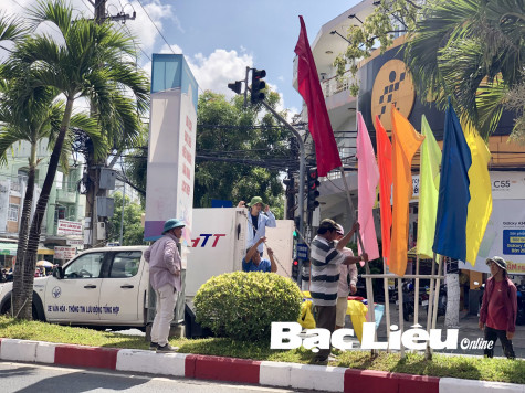 Treo cờ phướn trên đường Trần Phú (Phường 7, TP. Bạc Liêu). Ảnh: N.Q