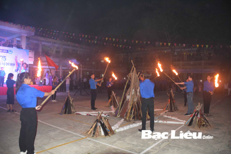 Cán bộ, đoàn viên - thanh niên Trường đại học Bạc Liêu cùng thực hiện nghi thức đốt lửa trại.