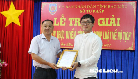 Ban tổ chức trao giải Nhất cá nhân trong cuộc thi trực tuyến “Tìm hiểu pháp luật về hộ tịch”. Ảnh: K.P