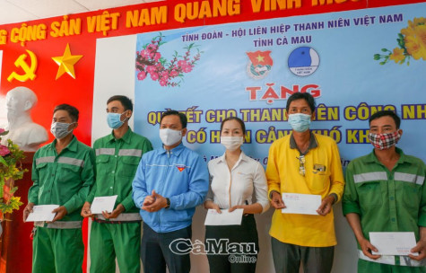 Tỉnh đoàn Cà Mau phối hợp với Công ty TNHH MTV Thương mại và Dịch vụ Kiện Toàn (huyện Đầm Dơi) trao tặng 20 suất quà Tết cho thanh niên công nhân có hoàn cảnh khó khăn trên địa bàn thành phố. Mỗi suất trị giá 500.000 đồng.