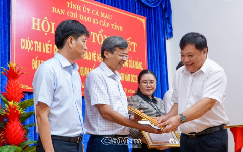 | Đồng chí Phạm Thành Ngại, Phó bí thư Thường trực Tỉnh uỷ tặng Bằng khen của Tỉnh uỷ cho 4 đơn vị xuất sắc tham dự cuộc thi: Trường Chính trị tỉnh; Ban Chỉ đạo 35 Huyện uỷ Năm Căn; Ban Chỉ đạo 35 Huyện uỷ Ngọc Hiển; Ban Chỉ đạo 35 Thành uỷ Cà Mau. |