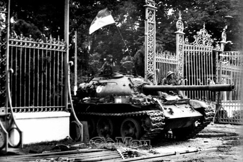 | Xe tăng quân giải phóng tiến vào Dinh Độc Lập, ngày 30/4/1975. Ảnh tư liệu |