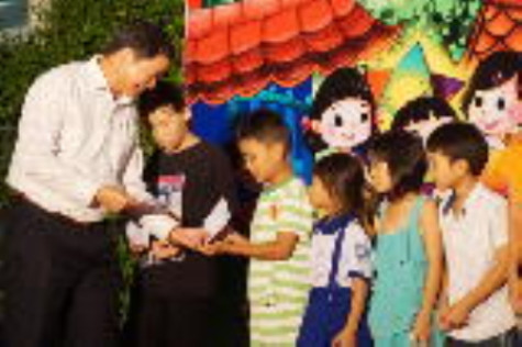 | Phó chủ tịch UBND tỉnh Cà Mau Thân Đức Hưởng tặng quà thiếu nhi tại Đêm hội trăng rằm. |