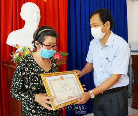 | Phó chủ tịch UBND tỉnh Cà Mau Trần Hồng Quân trao Bằng khen cho cụ Phan Thanh Nhàn. Ảnh: QUỐC RIN |
