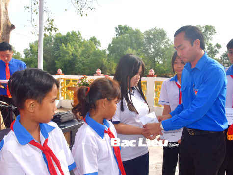 Bí thư Tỉnh đoàn - Phạm Tuấn Tài trao học bổng cho học sinh có hoàn cảnh khó khăn trên địa bàn TX. Giá Rai.