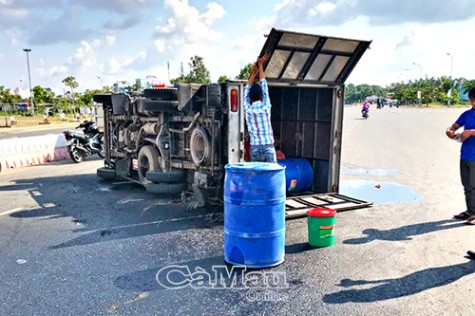 | Xe tải chở hàng lật tại giao lộ trước Trung tâm Hội nghị tỉnh Cà Mau. |