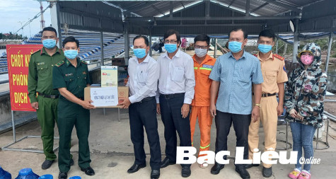 Thiếu tá Lê Văn Sao (thứ hai từ trái sang) tiếp nhận ủng hộ phòng, chống dịch. Ảnh: T.H