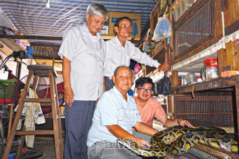 | Gia đình ông Huỳnh Văn Sơn (người ngồi bên trái) duy trì nghề nuôi trăn nhiều năm. |