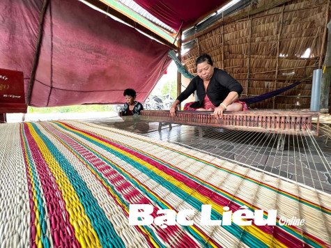 Bà Nguyễn Thị Chín (ấp Thống Nhất, thị trấn Ngan Dừa, huyện Hồng Dân) dệt chiếu khổ lớn theo đơn đặt hàng của khách. Ảnh: C.L