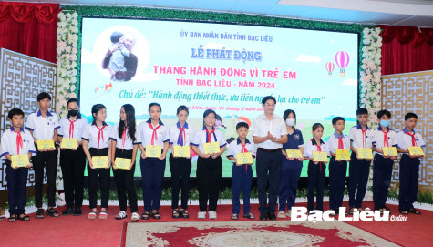 Tặng quà cho thiếu nhi nhân lễ phát động Tháng hành động Vì trẻ em năm 2024. Ảnh: K.P