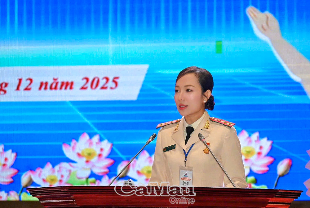 Đại uý Lâm Thảo Duy trình bày tham luận tại Đại hội đại biểu Đoàn TNCS Hồ Chí Minh tỉnh Cà Mau lần thứ I (Ảnh nhân vật cung cấp).