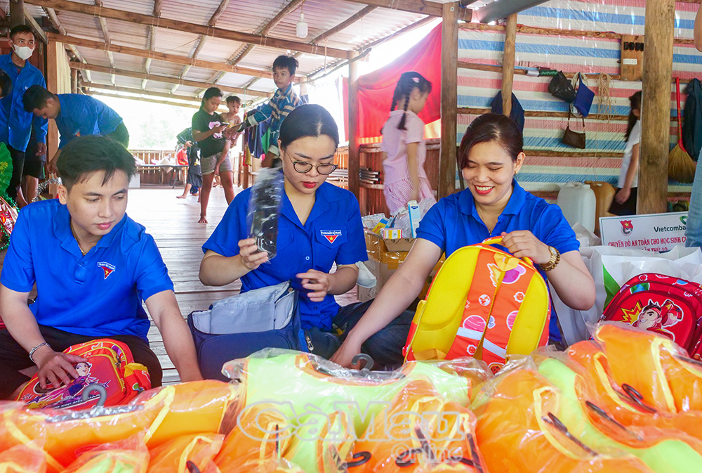 Chị Minh Hải (bìa phải) chuẩn bị quà cho trẻ em tại chương trình Chuyến đò an toàn cho học sinh cửa biển. Ảnh: TIẾN LUẬN
