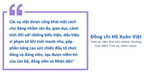 Nổi bật nhất là việc kiểm tra khi có dấu hiệu vi phạm về công tác mua sắm trang thiết bị y tế phòng, chống dịch Covid-19 tại Sở Y tế, Trung tâm Kiểm soát bệnh tật tỉnh; công tác quản lý, sử dụng đất đai đối với Ðảng uỷ Sở Tài nguyên và Môi trường; việc lãnh đạo, chỉ đạo quản lý, sử dụng tài chính, ngân sách của Ðảng tại Ðảng uỷ Dân Chính Ðảng... Qua kiểm tra, đã phối hợp với cơ quan có liên quan chuyển cơ quan Cảnh sát điều tra Công an tỉnh xử lý theo quy định của pháp luật 2 vụ việc; kiến nghị cấp thẩm quyền kiểm điểm trách nhiệm, xem xét, xử lý kỷ luật 3 tổ chức đảng và hàng chục cán bộ, đảng viên có liên quan đến vi phạm, khuyết điểm. Việc xử lý nghiêm những vụ việc này thời gian qua được dư luận, cán bộ, đảng viên và Nhân dân rất quan tâm, đồng tình, ủng hộ.