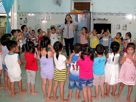 Cô trò Trường Mầm non Hương Tràm trong giờ vui chơi, giải trí.