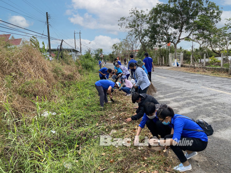 ĐV-TN ra quân làm vẽ sinh môi trường và trồng thêm cây xanh ở xã Vĩnh Trạch Đông (TP. Bạc Liêu). Ảnh: Hoàng Nam