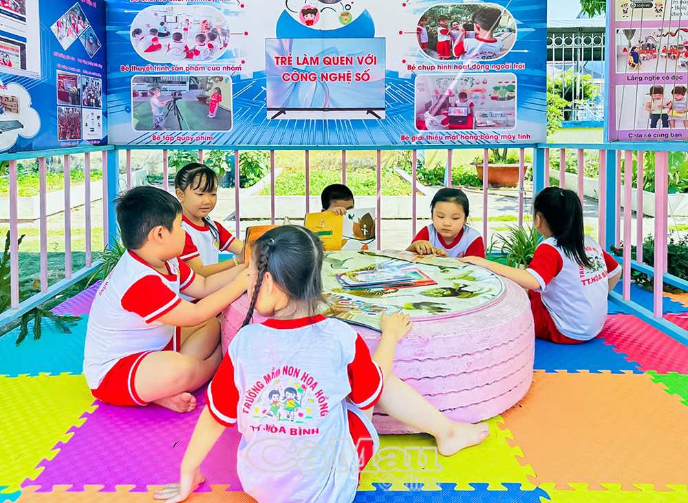 Trong khi đó, ở bậc học mầm non, việc lan toả văn hoá đọc cũng được triển khai với nhiều hình thức phù hợp với lứa tuổi. Tại Trường Mầm non Hoa Hồng (xã Hoà Bình) mô hình thư viện số đã và đang mang lại hiệu quả tích cực.