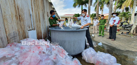 Lực lượng kiểm tra liên ngành tỉnh tiêu hủy lô tôm giống không rõ nguồn gốc, xuất xứ. Ảnh: C.L