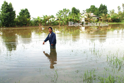 Mưa lớn và triều cường gây thiệt hại lúa mới sạ ở huyện Vĩnh Lợi.