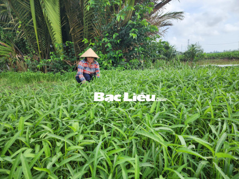 Chị Lâm Thị Si Na (ấp Cái Giá, xã Hưng Hội, huyện Vĩnh Lợi) thu hoạch rau muống bán cho thương lái. Ảnh: T.M