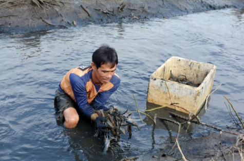 | Nông dân xã Biển Bạch, huyện Thới Bình thu hoạch tôm càng xanh. Vụ này mỗi hộ trong dự án, sau 6 tháng thả tôm, có thu nhập trung bình 50 triệu đồng. |