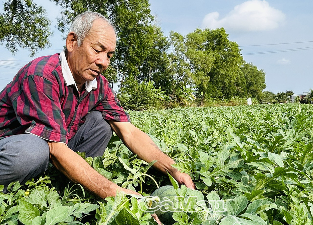 Ông Lâm Văn Đảm cần mẫn chăm sóc rẫy dưa hấu xanh tốt.