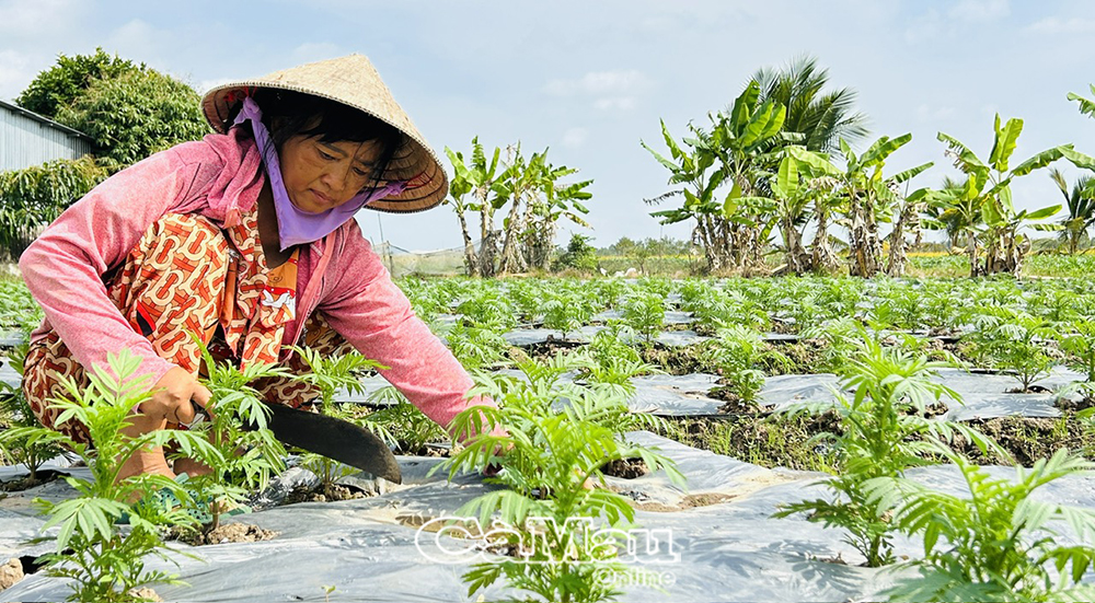 Tại khóm Ông Muộn, gia đình bà Nguyễn Kim Tiên là một trong những hộ gắn bó nhiều năm với nghề trồng hoa Tết, chủ yếu là hoa vạn thọ và hoa cúc nhiều màu. Năm nay, gia đình bà trồng khoảng 3.000 cây vạn thọ và 2.000 cây cúc, hoa hiện gần 1 tháng tuổi, sinh trưởng tốt, hứa hẹn trổ đều, đẹp đúng dịp Tết.