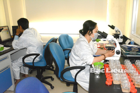 Xét nghiệm nguồn nước trước khi cấp vào ao nuôi ở Công ty tôm Việt - Úc. Ảnh: C.L