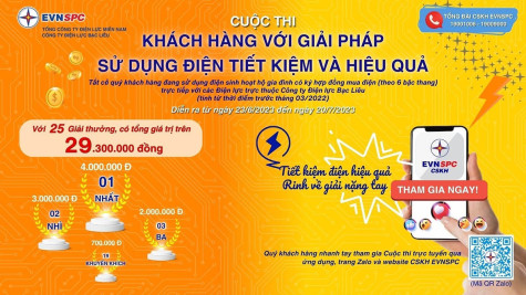 Cuộc thi “Khách hàng với giải pháp sử dụng điện tiết kiệm và hiệu quả” trên địa bàn tỉnh Bạc Liêu qua App, Zalo, Mail, Web CSKH EVNSPC do Công ty Điện lực tỉnh tổ chức với cơ cấu 25 giải thưởng, có tổng trị giá lên đến 29,3 triệu đồng được diễn ra từ ngày 23/6 - 20/7/2023.