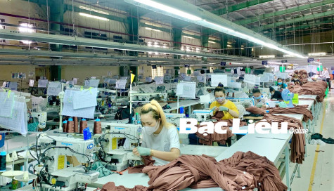 Công nhân Nhà máy may mặc (Công ty TNHH MTV Pinetree) tại xã Châu Hưng A (huyện Vĩnh Lợi) sản xuất hàng hóa trong điều kiện đảm bảo các điều kiện phòng chống dịch COVID-19. Ảnh: H.T
