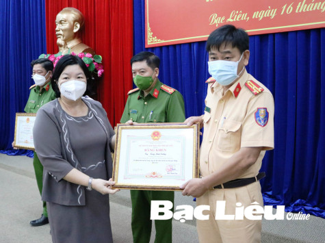 Bà Cao Xuân Thu Vân - Phó Chủ tịch UBND tỉnh (bìa trái) trao bằng khen cho cá nhân có thành tích xuất sắc trong công tác đảm bảo TTATGT năm 2021. Ảnh: T.H