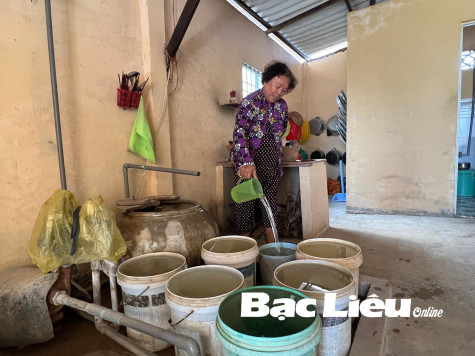 Người dân xã Hưng Hội (huyện Vĩnh Lợi) trữ nước để lắng, lọc trước khi sử dụng. Ảnh: C.L
