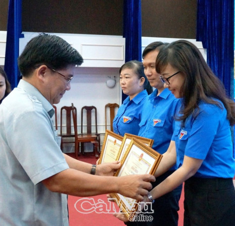 Bí thư Tỉnh đoàn Cà Mau Nguyễn Hoàng Đạo trao bằng khen cho các tập thể và cá nhân có thành tích xuất sắc trong chiến dịch thanh niên tình nguyện hè năm 2020