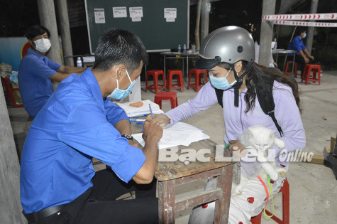 Nhân viên chốt phòng chống dịch COVID-19 (chốt Xẻo Chích, ấp Xẻo Chích, TT. Châu Hưng huyện Vĩnh Lợi) hướng dẫn người dân khai báo y tế khi từ địa phương khác vào địa bàn tỉnh.
