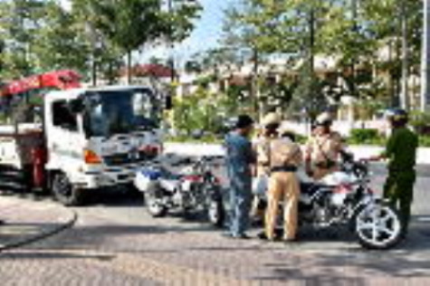 | Lực lượng CSGT xử lý ô-tô tải vận chuyển vật liệu xây dựng lưu thông trên đường Phan Ngọc Hiển vào ban ngày mà không được cấp phép. |