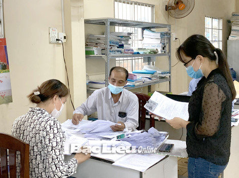 Cán bộ xã Hưng Hội (huyện Vĩnh Lợi) thực hiện các bước thủ tục trợ cấp cho người dân bị ảnh hưởng bởi dịch COVID.19. Ảnh: H.T