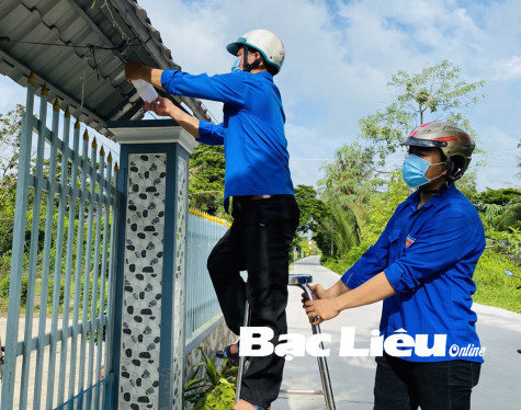 Đoàn viên - thanh niên huyện Vĩnh Lợi mắc bóng đèn thắp sáng đường quê tại xã Châu Thới (huyện Vĩnh Lợi). Ảnh: H.T