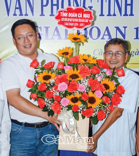 | Phó bí thư Tỉnh đoàn Cà Mau Nguyễn Ngọc Thuận (trái) tặng hoa ông Nguyễn Minh Chánh, nguyên Phó bí thư Tỉnh đoàn Minh Hải, chúc mừng buổi họp mặt. |