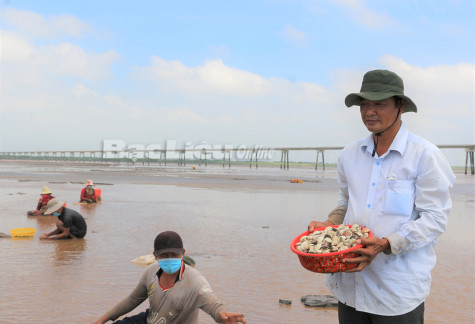 Xã viên HTX Đồng Tiến (xã Vĩnh Thịnh, huyện Hòa Bình) thu hoạch nghêu nuôi. Ảnh: M.Đ