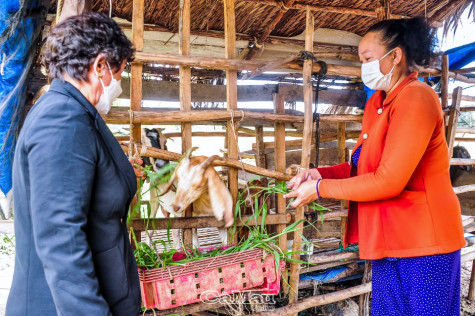 | Nhận được cặp dê giống, chị Nguyễn Thị Hiền (bìa phải), ấp Trùm Thuật, xã Khánh Hải, phấn khởi và tích cực chăm sóc, nhân giống để phát triển kinh tế, có cơ hội thoát nghèo bền vững. |