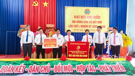 Đồng chí Nguyễn Hoàng Thoại, Chủ tịch Hội Nông dân tỉnh Cà Mau (thứ 3 từ trái sang); đồng chí Nguyễn Phương Đông, Bí thư Đảng uỷ, Chủ tịch HĐND xã Đất Mới (thứ 4 từ trái sang) trao bảng tượng trưng 2 tỷ đồng Quỹ Hỗ trợ nông dân cho Hội Nông dân xã và bức trướng chúc mừng đại hội.