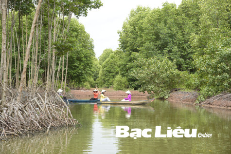 Du khách tham quan rừng phòng hộ ven biển huyện Hòa Bình bằng xuồng. Ảnh: H.T