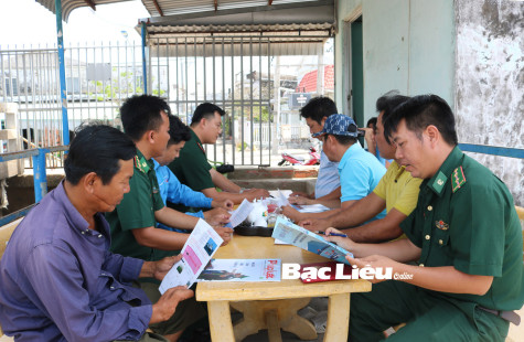 Đồn Biên phòng Gành Hào (huyện Đông Hải) phát tờ rơi tuyên truyền pháp luật cho ngư dân. Ảnh: T.H